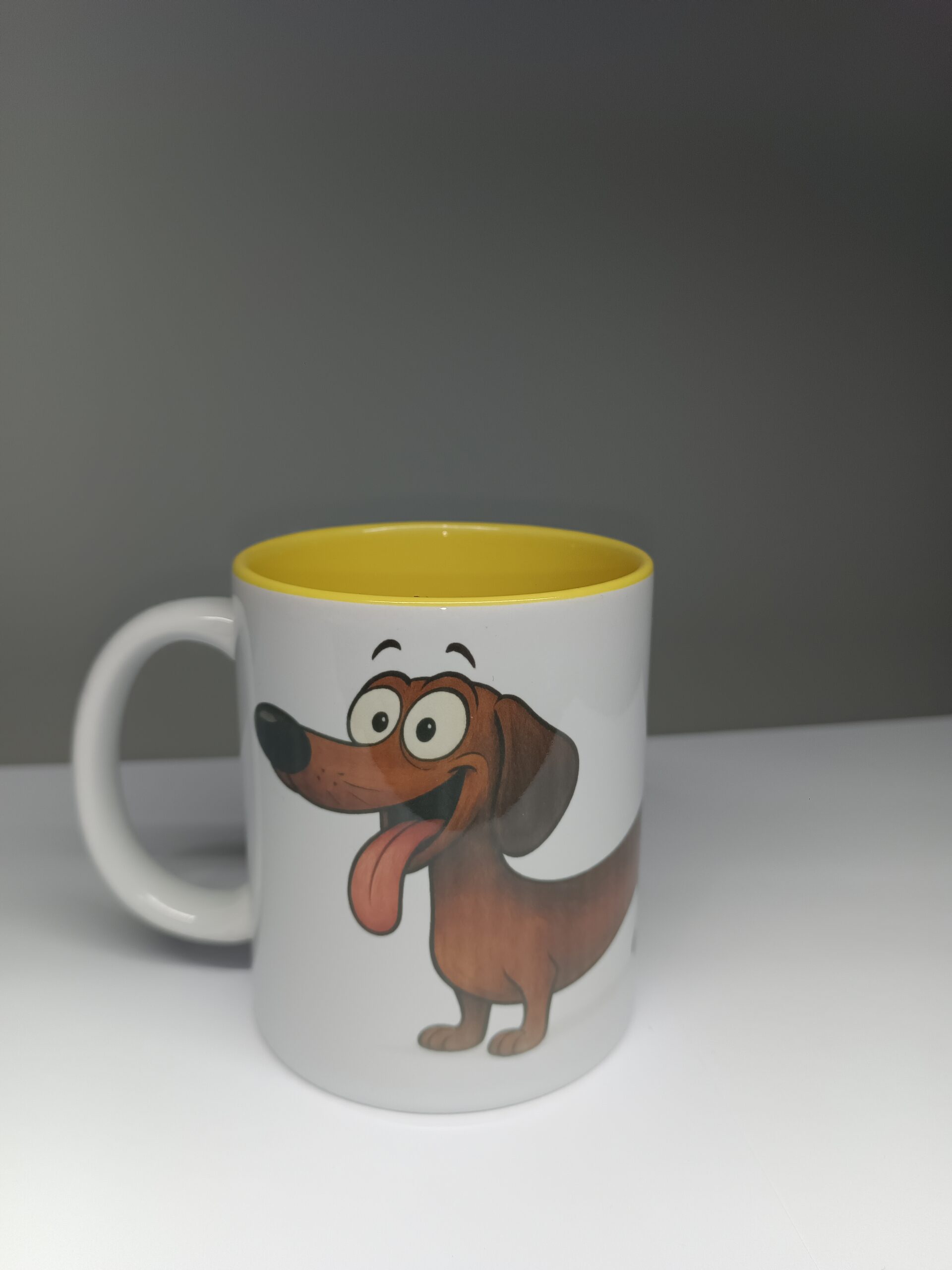 Radosny design: szczęśliwy jamnik na kubku sprawi, że nawet poniedziałek stanie się przyjemniejszy.